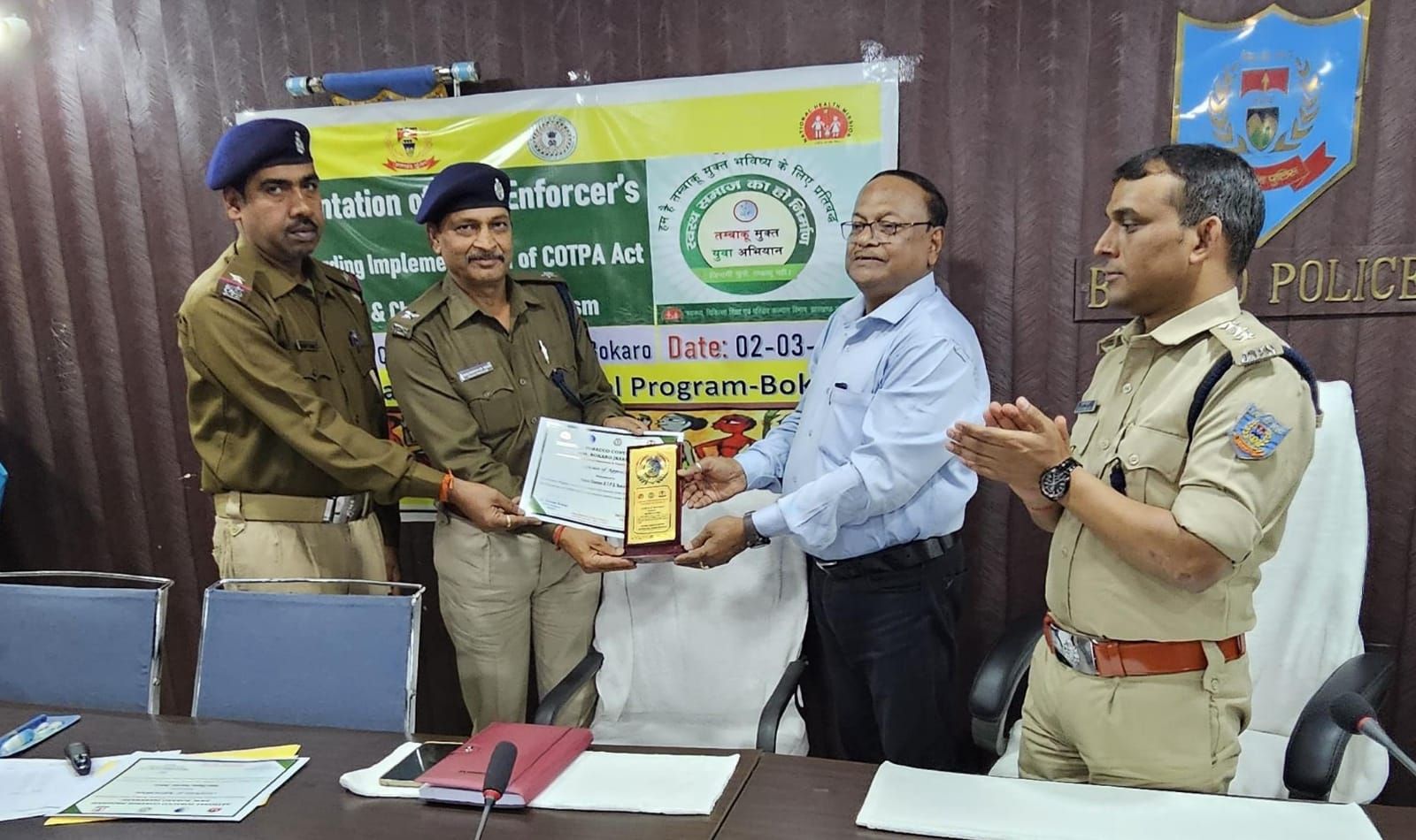 एसपी कार्यालय के सभागार में शनिवार को राष्ट्रीय तंबाकू कंट्रोल प्रोग्राम के तहत उन्मुखीकरण कार्यक्रम हुआ। उद्घाटन सिविल सर्जन डॉ दिनेश कुमार व मुख्यायल डीएसपी पवन कुमार ने किया। धूम्रपान निषेध अनुपालन व वित्तीय वर्ष 2023-24 में अधिक चालान करने को लेकर तीन थाना को प्रशस्ति पत्र व शील्ड देकर पुरस्कृत किया गया। 109 चालान काट कर पहले स्थान पर सेक्टर चार थाना, 75 चालान काट कर दूसरे स्थान पर बीटीपीएस थाना व 62 चालान काट कर तीसरे स्थान पर पेटरवार थाना ने जगह बनायी।