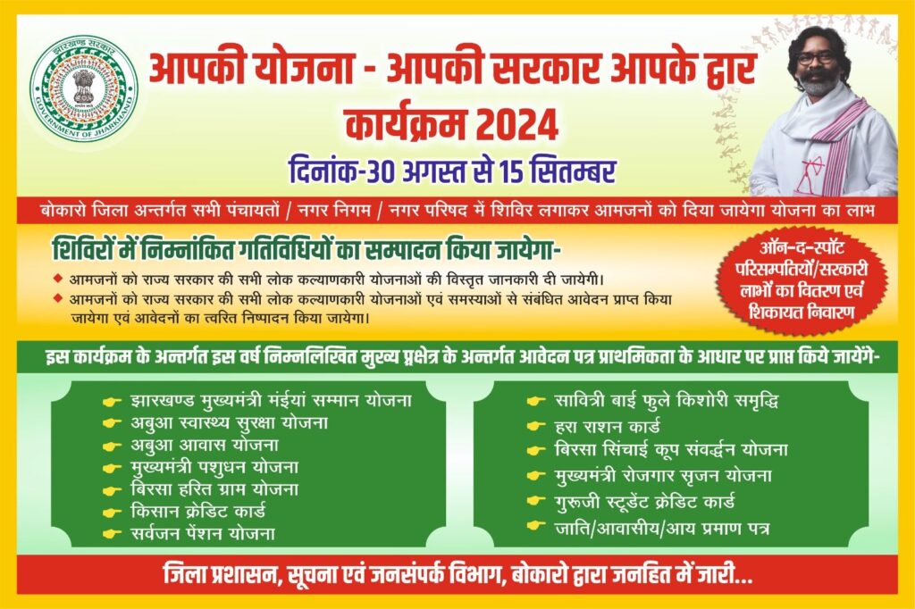 आपकी योजना आपकी सरकार आपके द्वार कार्यक्रम के जरिए आमजनों को राज्य सरकार की सभी लोक कल्याणकारी योजनाओं की जानकारी दी जायेगी. झारखंड मुख्यमंत्री मंईयां सम्मान योजना, अबुआ स्वास्थ्य सुरक्षा योजना, अबुआ आवास योजना, मुख्यमंत्री पशुधन योजना, बिरसा हरित ग्राम योजना, किसान क्रेडिट कार्ड, सर्वजन पेंशन योजना, सावित्री बाई फुले किशोरी समृद्धि योजना, हरा राशन कार्ड, बिरसा सिंचाई कूप संवर्द्धन योजना, मुख्यमंत्री रोजगार सृजन योजना, गुरूजी स्टूडेंट क्रेडिट कार्ड, जाति, आवासीय, आय प्रमाण पत्र आदि कार्य का संपादन होगा.